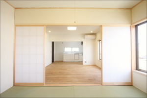 お部屋の配置は、LDKスペース、畳を敷いた寝室、そして将来子供部屋になる予備室の2LDKの居住空間になります。2階に居住空間を配置するメリットである、日当たりや風の流れ等も考慮して設計しました。