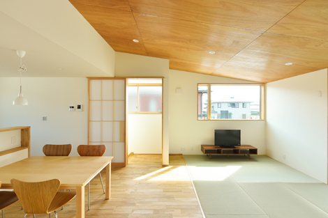 - 屋根形状を利用した、のびやかな勾配天井のリビングには畳を敷きこみました。いつでもどこでもゆったりとした畳の上でゴロンとリラックス。