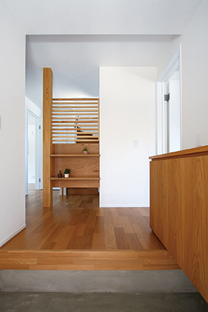 アプローチの奥には、ポーチを兼ねた5帖分のテラスを設けました。雨の日やお隣さんの視線から守りつつ、趣味のアウトドア用品のお手入れもできるゆとりのある空間です。