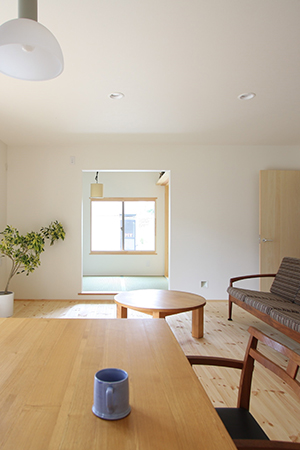 閑静な住宅街の中にありながら、土手沿いに向かって視線が抜ける開けた景色を取り入れて計画しています。北向約11mの間口を活かし、建物の脇に駐車場を配置することでアプローチと前庭、南側には約20坪の大きな主庭ができました。「休日は庭遊びやBBQを楽しみたい」という要望から、庭につながる18帖のLDKには大きな窓と下屋を設け、外と内を緩やかにつなぎます。開放的なリビングの隣には3帖の畳コーナー。ここはリビングだけではなく、玄関にもつながっているので、来客時や少し近所に出かける時などの裏動線にも。また、少しこもった感じの空間からメリハリが生まれ、ワンルームの空間にたくさんの居場所をつくっています。