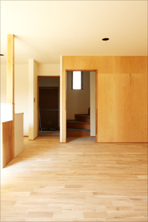 長男であるお施主様のご主人は、もしかすると親御さんとの同居も将来的には可能性があるという事から、親御さんの為に和室を造っておきたいとご要望がありました。しかし同居しなかった場合には開かずの間になってしまう可能性があると言う問題がありました。そこでリビングと和室を併設させて、さらに3帖のクローゼットを設けました。同居前は、建具を全開にしてリビングと一体の空間にして使用します。い草の心地よい香りがリビングにもひろがり、ご家族をリラックスさせてくれます。3帖の大きなクローゼットは子供が大好きなおもちゃや本などを収納し、親御さんを迎える時にはお布団や衣類の収納としても使えるよう設計しています。