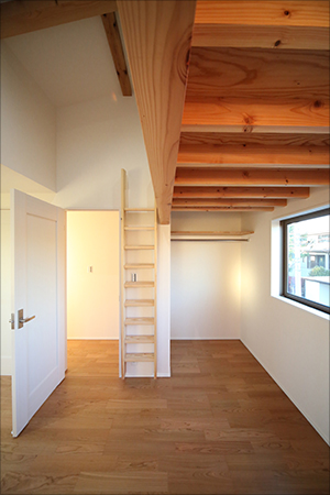木が好きなご家族。あたたかな手触り。年月とともに風合いを増す質感と色調。ユーカリの古材をつかった、表情豊かな室内。でもどこか懐かしい心地良さ。小さい頃に木登りしたように夢が広がるこども部屋には、ドキドキ・ワクワクのロフト。杉でつくったはしごを裸足の足の裏でしっかりつかんでのぼる。おおらかに育つこどもたちの記憶にいつまでも残る木の感触。