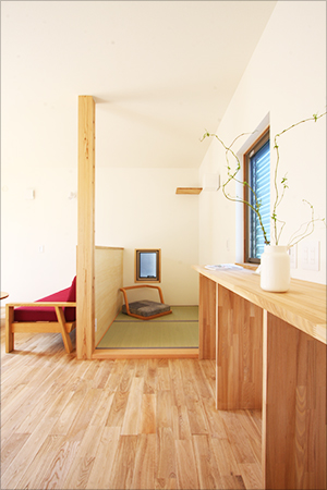 そのカウンターの奥につながっている1.5帖の畳スペースは、読書コーナーとして、または仕事スペースとして、ある時はのんびりお昼寝スペースとして多目的に活用できる空間です。