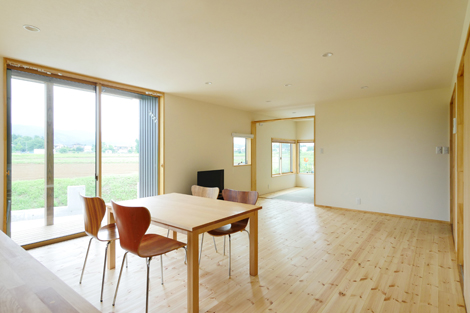 建物は、延床約36.4坪。今回リビングをあえて西側に設置しました。台形の敷地を生かす事で、周囲の視線を気にすることがなくなります。妙高山脈と田園風景の大パノラマを眺めながら家族と過ごせます。リビングと接する和室は仕切り方をちょっと工夫しました。これにより、大空間として家族や友達とワイワイ過ごすこともできるし、仕切れば両親や友人達が泊まったり、畳でゴロっとリラックスできます。ただ、仕切っても家族のぬくもりを感じる工夫があります。また、家の配置・形状を考える事で雪対策を行いました。消雪パイプ等の設備だけでなく、自然の力を利用する事で自然落雪や雪解けを早める工夫を考えました。 そして、職人の技と無垢材を随所に利用する事で、そこに住むご家族の個性やこれからの暮らしがより快適に、より楽しくなるアイディアや工夫がいっぱいです。