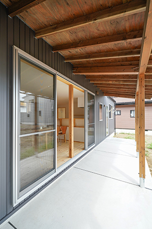 リビングにつながる長いポーチでは、自然を感じながら家族で会話をしたり、軽い食事、昼寝もできます。深い軒先にする事で、ちょっとした雨も大丈夫です。そして、サイドに壁を設置することで、閉鎖的にならず気持ちよく過ごす事ができます。