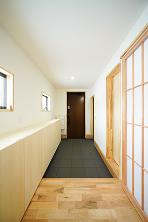 南東に設置した玄関は北西からの強い風を避けます。玄関からリビングに向う廊下には大容量の本棚を設置。専門書から、小説、資料、お子様の絵本等、静かに読書を楽しんだり、お子様の絵本を読んであげたり、自然な家族の交流のきっかけです。その他にも、脱衣、洗濯、物干、収納の気になる動線を出来るだけ短くしました。こちらも見所です。