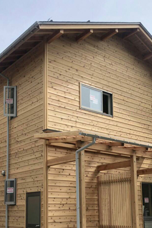 整形敷地を活用するために建物を斜めに配置しています。気取った意匠では“変わり者”と見られることもあるのでシンプルな切妻屋根と、あえて玄関ポーチの屋根は波板ポリカで素朴さも出しています。実は南にあたる裏庭だけではなく、総二階の建物が建っても隣接するご近所さんにも採光を届ける役割も果たしてくれます。塩害を軽減するため杉板張りの外壁や、ステンレス葺きの屋根などにコストを充てるためにバランスを考慮しています。
