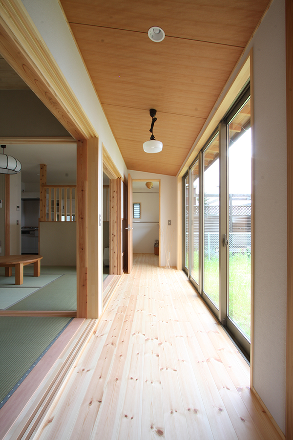 和室には雪見障子をつけました。日差しをよけたり、お庭を眺めたり、季節を感じ、外の良さをゆるやかに取り入れられます。またご近所の方とお話ししたり、畑仕事の合間に一休みしたり。縁側に腰を掛けた時、お部屋まで丸見えはちょっと・・・なんて時も障子でさっと隠すこともできます。
