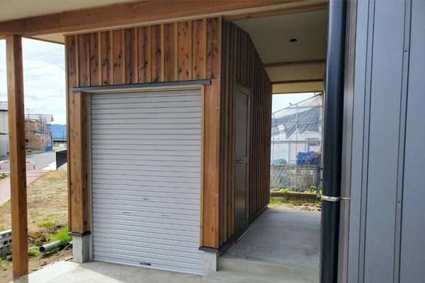 建物と一体化した大きな外収納。ご主人様のお仕事道具やアウトドア用品、バイクなども収納できます。もちろん収納だけでなく、作業スペースとしても利用できます。休日は秘密基地のような過ごし方も良いかもしれません。