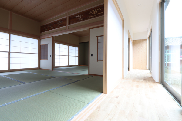 「実家」と呼べる家の在り方を考えました。久しぶりに訪れた家族もほっと安心するような、以前のお住まいの雰囲気を守りました。玄関から直接いける和室は天井を高く設定し、欄間やふすまは以前のものを使用しました。以前のお住まいから大切に使っていたものは丁寧に解体し、さらに次の代まで役目を果たせるよう煤竹などもお引越しをしています。