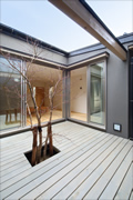 日当たりの悪さを解決するため、コートハウス(中庭プラン)を設け、室内と室外とのあいまいな関係を結び、開放感をあたえました。コートには樹木(ハウチワカエデ)を植え、若葉や新緑、紅葉、落葉など自然と四季の変化に楽しみを与えます。