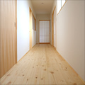家の素材は、床にアカマツ、扉は米松など天然無垢素材を使用しています。天然無垢素材は暖かく香りも良く、色の変化も楽しめます。特に松は色の変化が早く、年々味わい深い色となり美しく変化します。住まい手にとっては最適なインテリアになることでしょう。