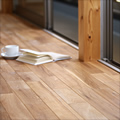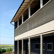 建物自体は自然の「無垢材」をふんだんに使用。ナラ無垢のフローリング、外壁の鉄板(ガルバリウム鋼板)やガラスコンクリートなど、素材の持ち味を活かしながらも、決して主張することなく、環境になじんだ飽きの来ないシンプルでモダンな表情を演出した建物です。