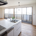 キッチンからサニタリーまで、生活機能を2階に集中させました。広々したリビングや浴室から外の景色を楽しめます。1階寝室には、大きなウォークインクローゼットを配置し、季節ごとの衣類や雑貨品を整理するのに便利です。