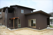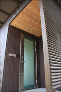 屋根ポーチはスギの羽目板をし、上品さと、高級感を演出しています。ブラウンの外壁にサッシ等の色も合わせることで、全体的に落ち着きのある外観に統一しました。
