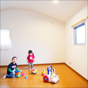 1階廊下奥に、たっぷりとった収納と勝手口を設けました。限られたスペースですが、とても機能的にお使いいただけるようになています。2階に設けたフリースペースは、夜はご主人様が会社より持ち帰った仕事をする大切な空間。昼間は3人いるお子さんがそろって勉強できるスペースになっていて多機能に活躍します。