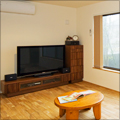 全部で22帖のゆったりしたLDK。リビング、ダイニングからお庭を眺めることができます。床にナラの無垢フローリングを使い、家族みんなが気持ちよく過ごせる空間に仕上がりました。ご主人がテラスでサンサンと太陽の光を浴びながら、お庭で遊ぶ3人のお子さんと会話をしているところを、対面キッチンで料理を作っている奥さんが笑いながら家族を見守り、どの場所にいて、みんな別々なことをしていても、笑い声や会話が聞こえてくる家族のコミュニケーションとお庭の自然を生活に取り込んだLDKになりました。