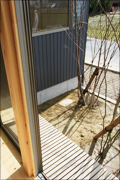 外観は周りの環境になじんだモダンなデザインになっています。緑が好きなご家族。植栽計画を考慮したお庭へはダイニングスペースからの出入りが直接できて、生活の中に自然を取り込めるように設計しました。バルコニーには、風が通る程度に壁を儲け、少しくらいの雨が降ってもぬれにくいような工夫がしてあります。