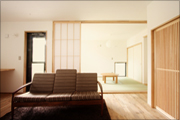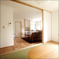 4DK、延床面積31.16坪のお宅です。限られた空間の中で、どうしたら家族が伸び伸びと生活できるのか?毎日生活の中でリラックスできるのか?お施主様と練りに練った結果、出来上がったのが、心地よい距離をとった食堂と居間(和室)です。普段は開放してLDKとして使用するのですが、お客様やご両親が来られたときにお通しし、宿泊されてもプライバシーを確保できるよう設計してあります。ふたつのお部屋共、南側に面した庭と接し、気持ちよく生活できるように考えてあります。