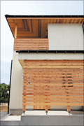外観は杉材の美しい木目の格子がアクセントになっています。街並みを考慮し、風景の一部となるようにデザインしています。