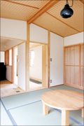 こちらのお住まいは、老後の生活になったときには、すべて1階で生活ができるよう設計してあります。例えばリビングに畳を敷き、当面は家族の集うリビング・客間として使用。そして将来はご夫婦の寝室になる予定です。リビングに畳を敷くことにより多様性が生まれ、一部屋で何役にも多目的に早変わりします。