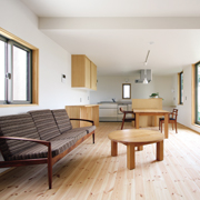 ご家族にとって居心地一番を良くしたかったダイニング中心のLDKは約20帖。そこに3帖の小上がり畳スペースや1帖のワークスペースなどを設け、無垢材や自然素材での造作で落ち着いた雰囲気をつくりだしています。天井高を工夫して、四季を通じての日照まで考慮し、解放感や包まれ感を演出しました。
