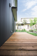 南側の庭と室内をつなぐ4帖のウッドデッキは、洗面室にもつながっています。家と庭を回遊できる動線は、子供たちと楽しみながら洗濯などの毎日の家事をするためのちょっとした工夫です。また、家族でガーデニングを楽しんだり、時には友人たちを招いてBBQでにぎやかに過ごしたり。LDKと庭をつなげるデッキは第二のリビングとして、家族の暮らしを豊かにしてくれます。