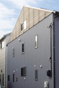 街並みにとけ込むよう落ち着いたグレーの外壁を設定。無機質なガルバリュウムも丸小波を選択したことで柔らかな印象に。三角の横格子部分は西日対策として設置。熱のこもりやすいロフトスペースで快適に過ごすための配慮です。