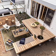 スノーピークのオリジナルタープを掛けてガーデンテーブルをセットし、ウッドデッキにクッションをはめると大きな屋外デッキラウンジが完成します。屋内と連続するこのスペースで、家族や仲の良い友人たちと大人数で野遊びを楽しめます。