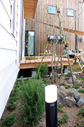 「緑豊かな街」になるように、この家では3つの庭を設けています。それぞれに趣の異なった樹木を植えて四季を楽しみます。アウトドアリビングには雑木のコナラとカツラを、アプローチ脇の前庭にはハーブ類とオリーブを。洗面前の朝の庭には幹の美しいシラカバを植えています。時間の経過とともに成長する緑が楽しみです。