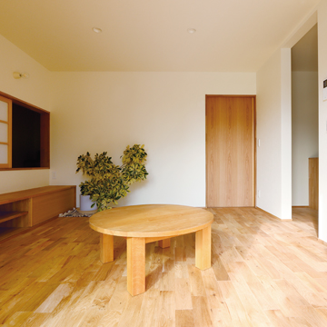 ウッドデッキを通して外とゆるやかにつながるリビングには、家族が自然と集まります。大きな窓からは、春は桜が見え、吹奏楽部が演奏する音楽が聞こえます。自然素材の床や手作りの建具からは、木の香り、サラサラとした手触りや柔らかな踏み心地、そこにいるだけで優しい時間が流れます。