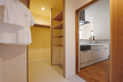 家事スペースは集中させ設けました。キッチンからもリビングからも移動することができるファミリークロゼットと物干しスペースは、洗う・干す・しまう・着替えるが最短時間で叶います。暮らし方は、家族の成長とともに変わるもの、だからライフスタイルの変化に対応できるきめ細やかな収納と動線があると便利です。“ただいま”から手を洗い着替えるという日常の動きを考慮して、手洗いスペース、クローゼットを配置しました。花粉やほこり、ウイルスを生活空間へ持ち込むことを防ぎます。メリハリのある生活を送り、子ども達の自立心を育てるためのプライベートスペースもしっかりと設けました。ご主人様の書斎はあえてコンパクトに。まるで秘密基地のような手を伸ばせばなんでも手が届く距離にしました。また、書斎は家族の雰囲気を感じ取れる距離感に。パブリックスペースとの間に障子を設けました。声をかければすぐわかる、ほどよい距離があるとお互い心地よく過ごすことができます。暮らし方を考え、家事の動線を最短にすることで大切な家族とのかけがえのない時間を今よりもっとつくることができます。
