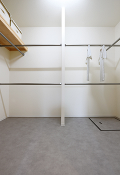 玄関近くのファミリークローゼットは、帰宅してから着替えたものをさっとしまうことができます。「後でしまおう」と一時置きする必要がなくなります。お子様も“ただいま”“手洗い”“しまう”の習慣が自然と身に付きます。動きに合わせて配置してある為、リビングはいつもすっきりです。また効率よく洗濯物を乾かす事ができる物干しスペースは1階に設けました。洗濯物をしまう時間はできるだけ短い方が楽。ファミリークローゼットとの距離も近く、気が付いた人がしまうことができます。