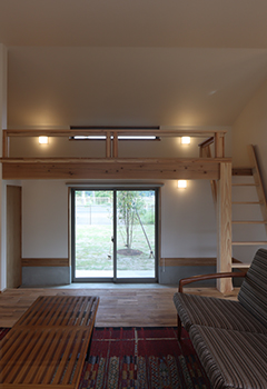 こちらの家には秘密基地のような空間が2つあります。そのうちの1つがリビングにあるロフトです。リビングより1段下がったスペースに土間、上がロフト。こちらはワンちゃんと家族が仲良く暮らす工夫です。土間スペースはワンちゃんの専用スペースです。上は荷物を置いたり、秘密基地のように使って頂けます。高低差で空間を仕切ることで、扉や壁で仕切るのとは違い解放感はそのままに使い方を分けることができます。